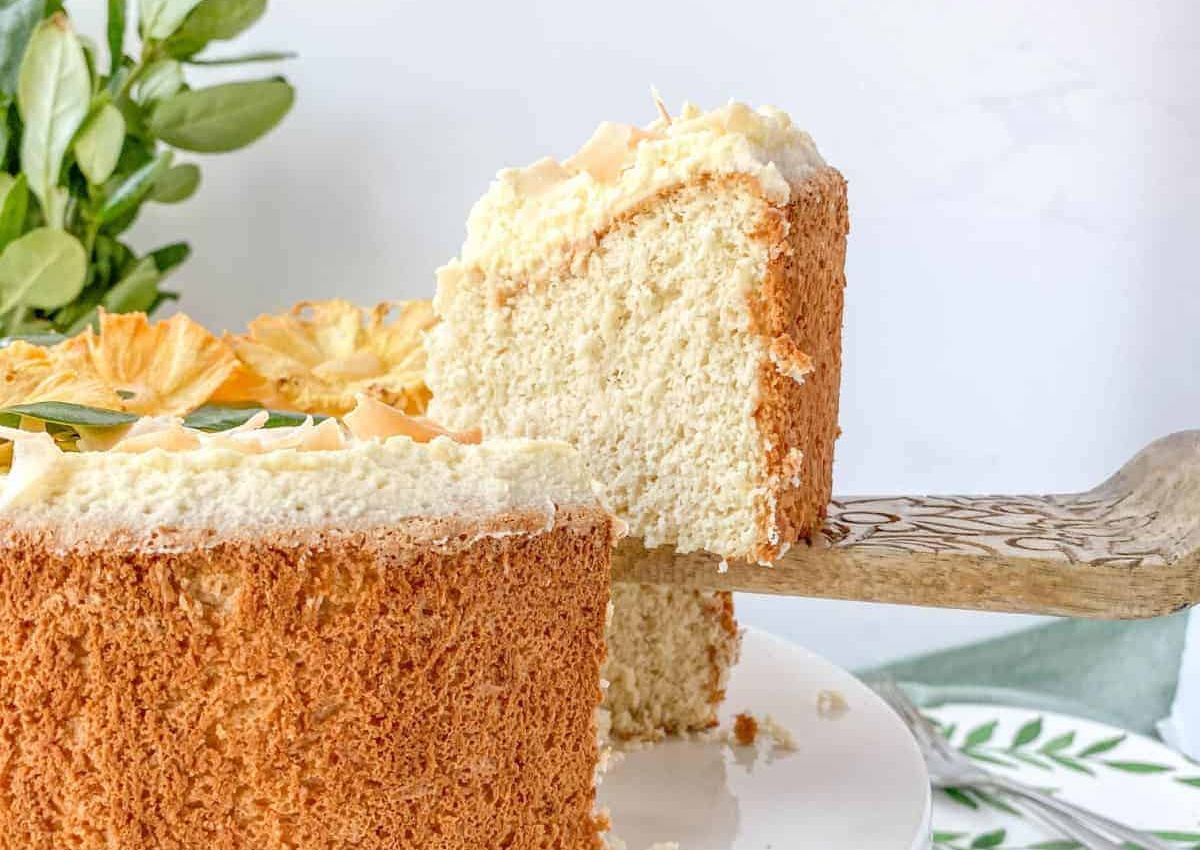 Light, airy cake with tropical fruit flavors. No butter, whipped egg whites create soft texture. Often served with fruit topping. Each slice is fluffy, fruity, and delicate.