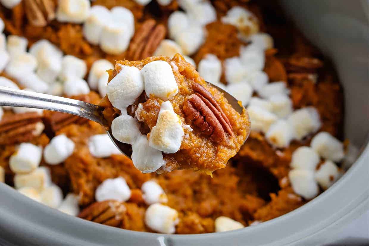 A spoonful of sweet potato casserole topped with mini marshmallows and a pecan, held over a dish of the same casserole.