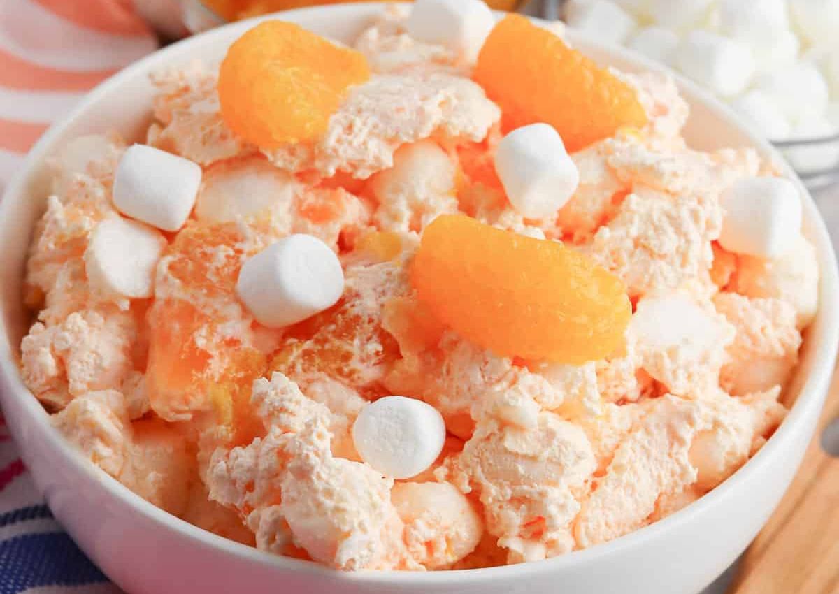 This soft, dreamy dessert channels the flavor of the classic frozen treat with orange gelatin and vanilla pudding. Whipped topping makes the texture ultra light, with marshmallows folded in for extra bite. The flavor leans sweet and citrusy. Great for summer parties or casual desserts.
