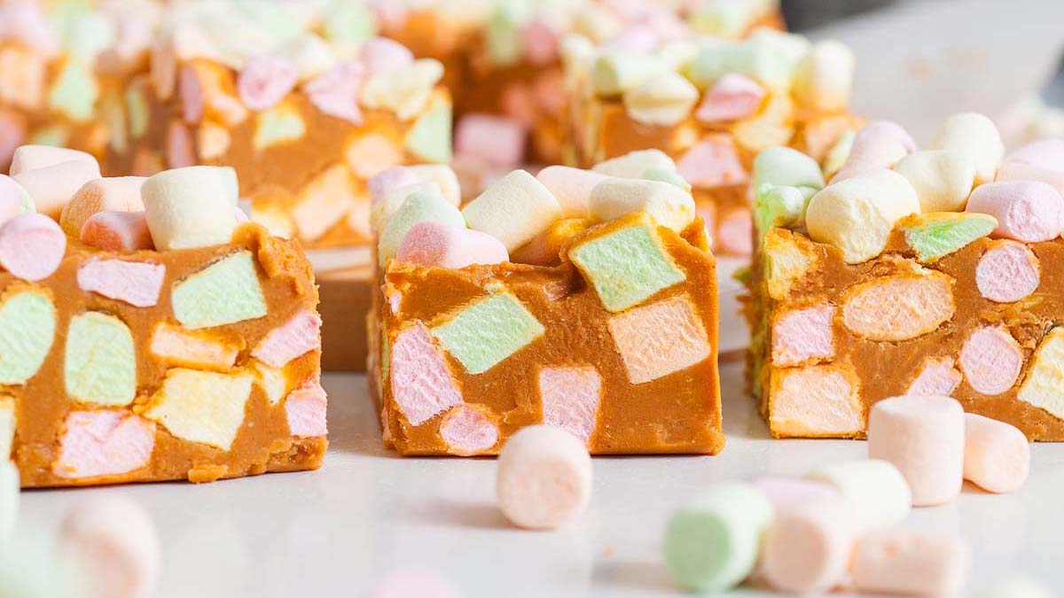 Creamy fudge is studded with colorful sprinkles. Cutting it into squares shows the festive interior. Sweet and dense, it is easy to make in advance. Sprinkles add both flavor and visual fun.