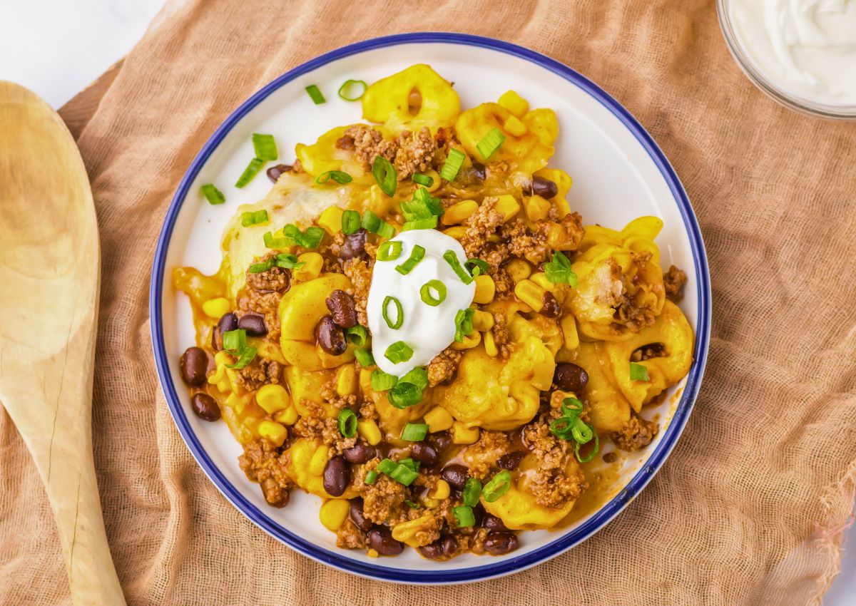 Cheese-filled tortellini takes the place of traditional tortillas for a fun variation. Ground beef mixes with sauce to coat the pasta. Baking allows the flavors to meld together perfectly. Itโs a hearty dish thatโs a little different from the usual enchilada approach.