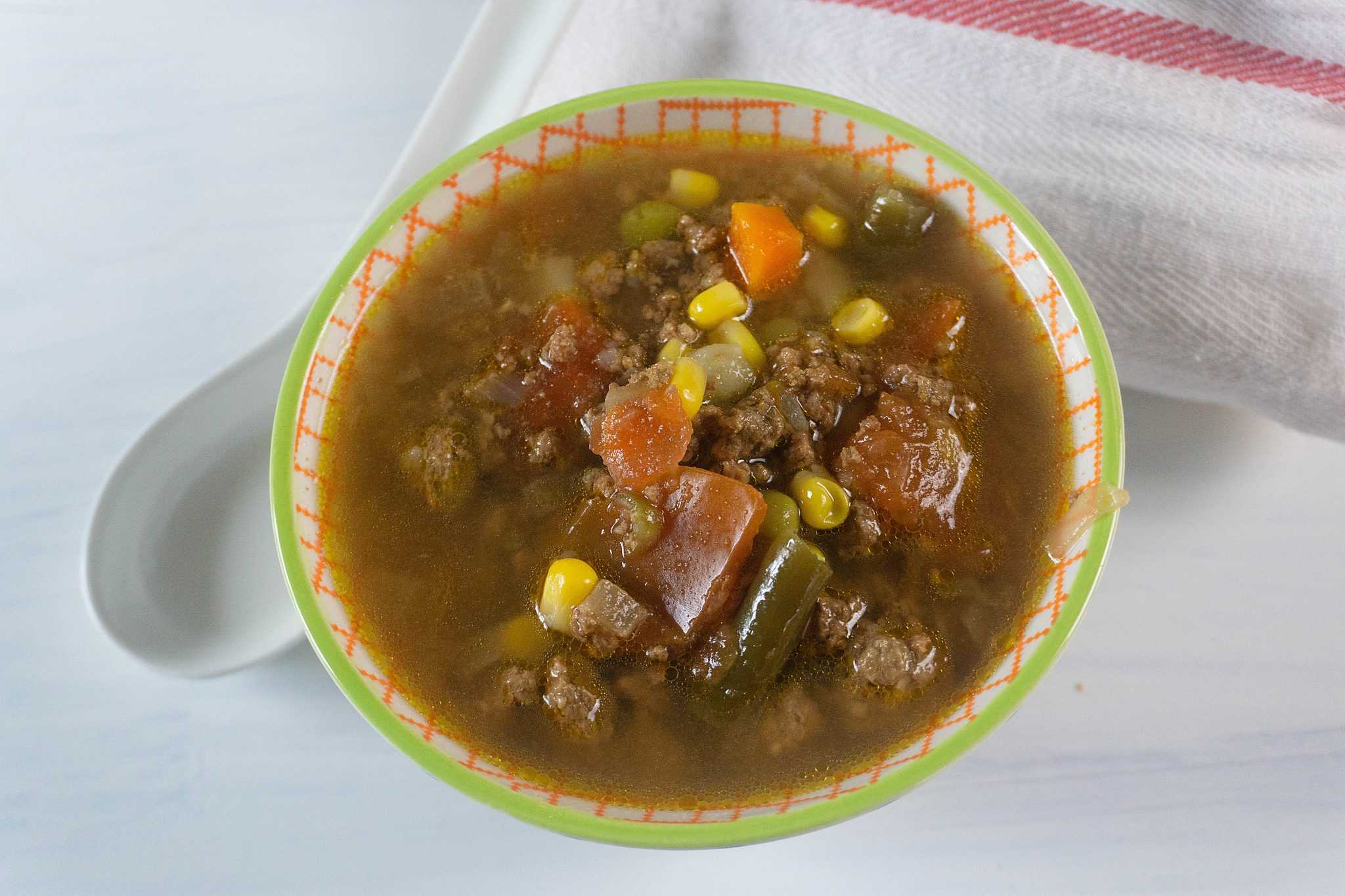 Ground beef, vegetables, and broth come together in this simple and filling soup. Itโs like a deconstructed burger in a bowl, with tender potatoes or pasta standing in for the bun. The tomato base ties it all together. Kids and adults both dig in.