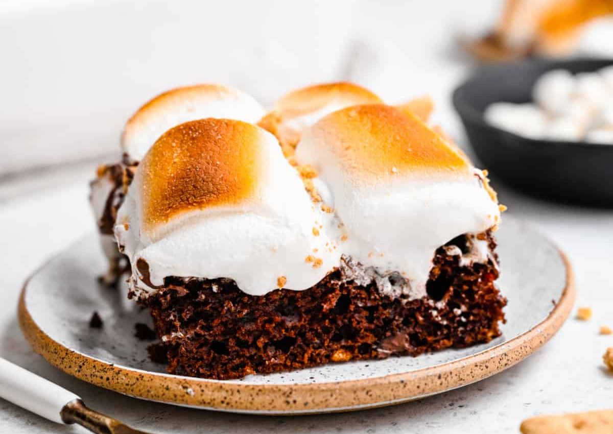 A tender layer cake stacked with chocolate and marshmallow filling, then frosted with graham crumbs for crunch. It slices beautifully but still delivers that gooey s’mores feeling. Great for parties where you want shareable nostalgia. Campfire dessert, made elegant.