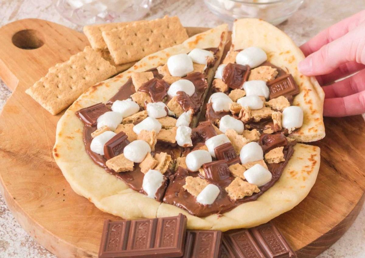 This dessert pizza starts with a crisp crust, then gets layered with chocolate and marshmallow, broiled until bubbly, and topped with graham cracker crumbs. It’s large, shareable, and melts perfectly. Slice it up and serve with coffee or milk. Sweet, fun, and pizza-like.