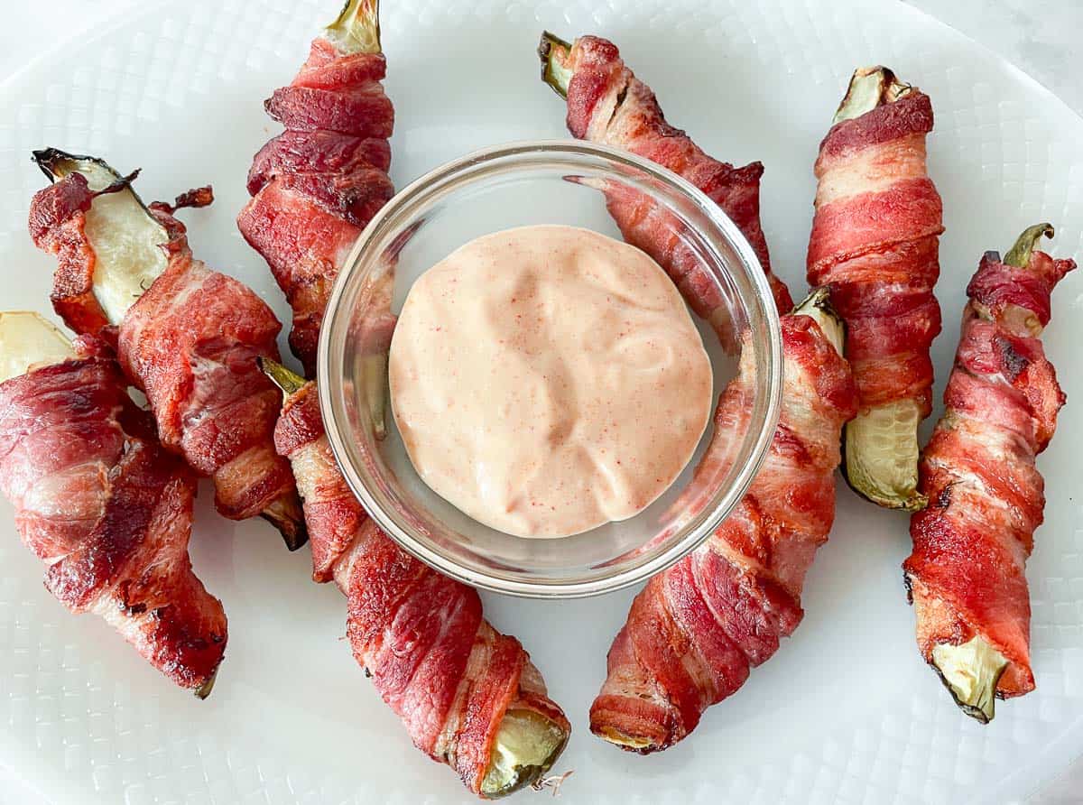 Six bacon-wrapped jalapeรฑo poppers are arranged around a glass bowl of creamy dipping sauce on a white plate.