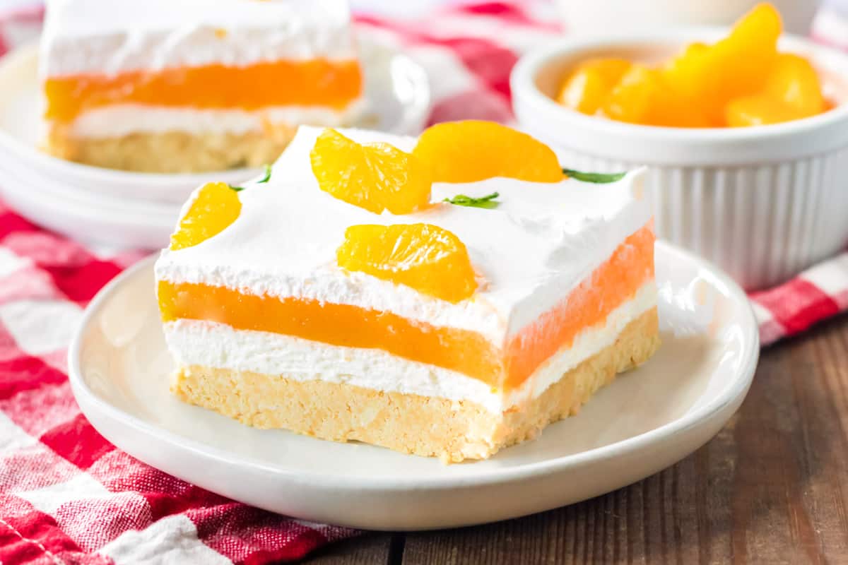 Orange flavor and creamy layers mimic the classic creamsicle treat. The crust adds slight crunch. Layers blend smooth textures with bright citrus flavor. Each slice is colorful and refreshing.