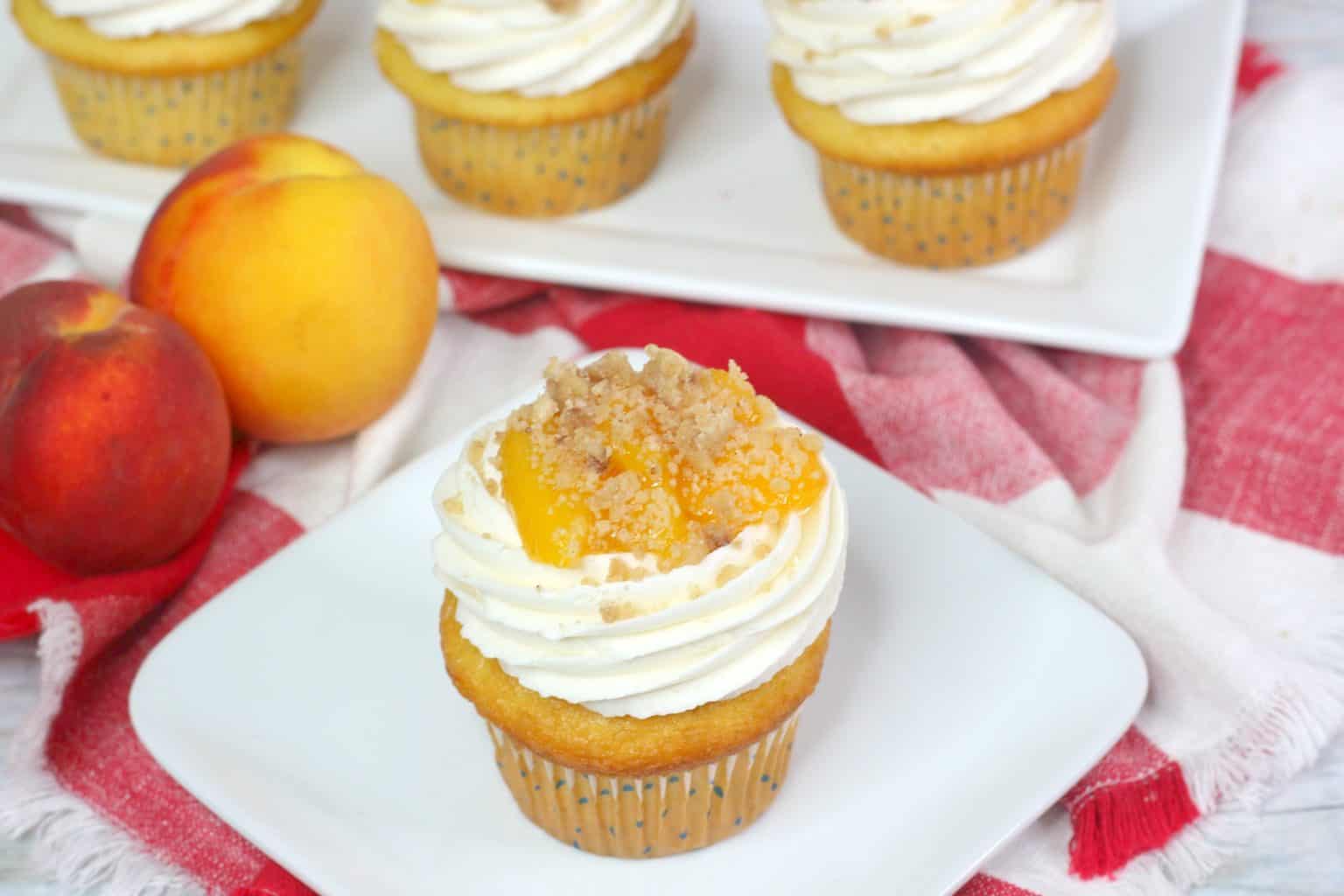 Cupcakes filled with peach slices and spiced cake. Topped with crumble or frosting. Sweet, fruity, and tender. Each bite tastes like mini peach cobblers.
