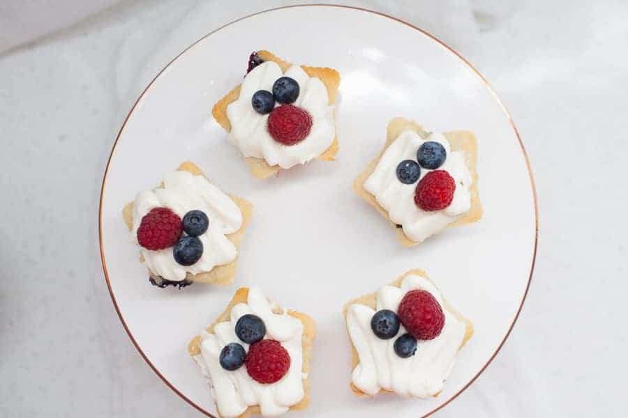 Cupcakes decorated with patriotic stars and swirls of red, white, and blue frosting. Vanilla or chocolate base. Fun for Fourth of July or patriotic celebrations. Each bite is colorful and sweet.