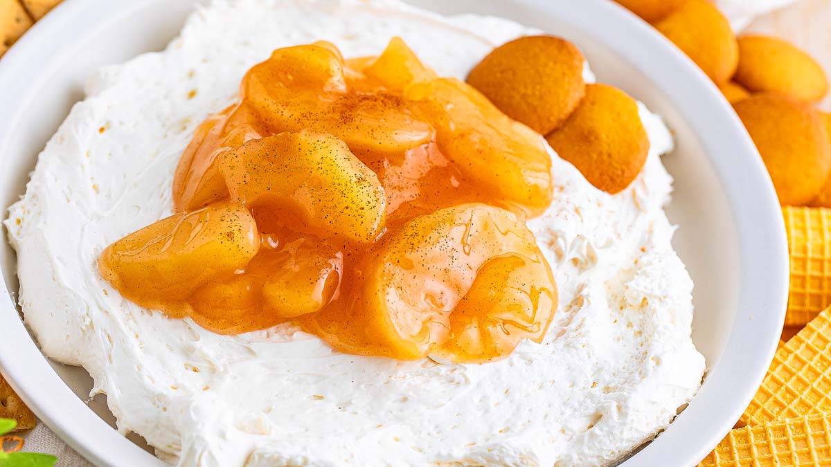 A layered dip blends cheesecake with apple pie filling and spices. It is served with cookies, graham crackers, or apple slices. The texture is creamy with chunks of apple. It is a fun twist on classic cheesecake.