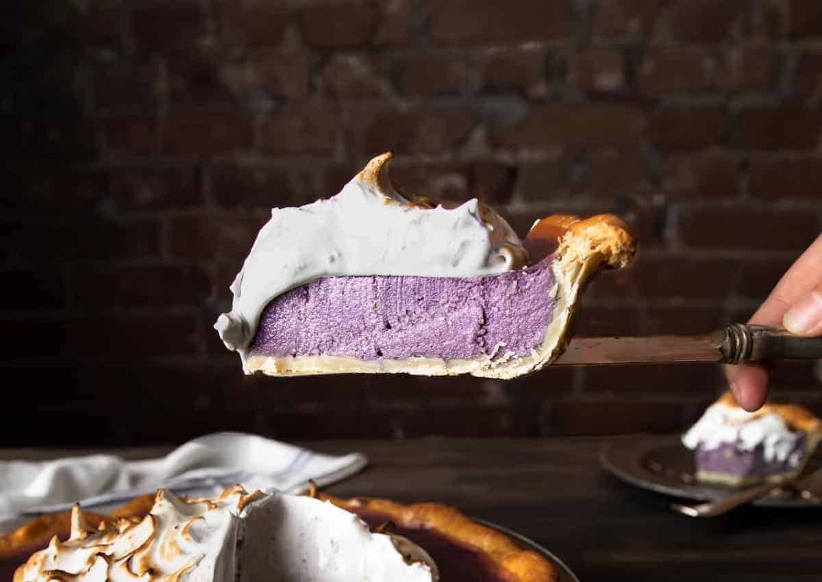 This pretty pie features a lightly-spiced purple sweet potato custard, buttery pie crust and a fluffy, toasted Swiss meringue topping! It’s a gorgeous dessert to adorn your holiday tables!