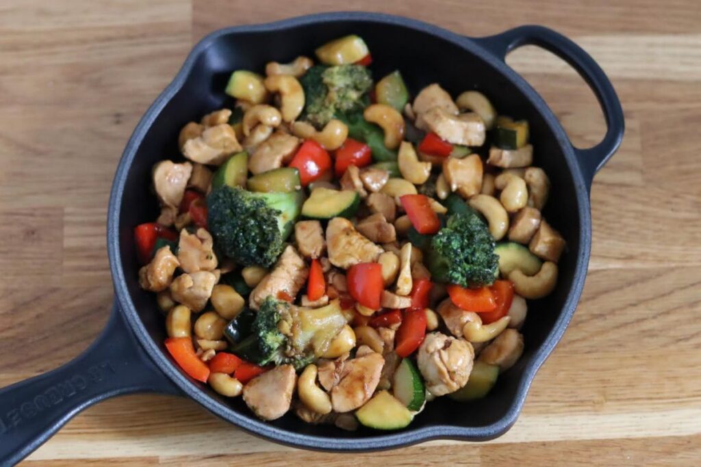 Cashews add crunch to tender chicken and vegetables. A simple stir fry sauce binds flavors together. Quick cooking keeps vegetables crisp. Each serving delivers protein, nuts, and vegetables in one dish.
