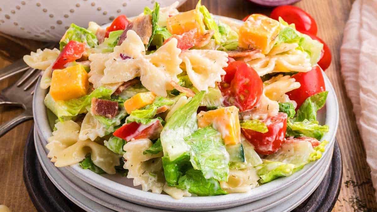 This BLT pasta salad brings together creamy dressing, crispy bacon, and fresh tomatoes. It delivers classic BLT flavor in an easy pasta salad form.