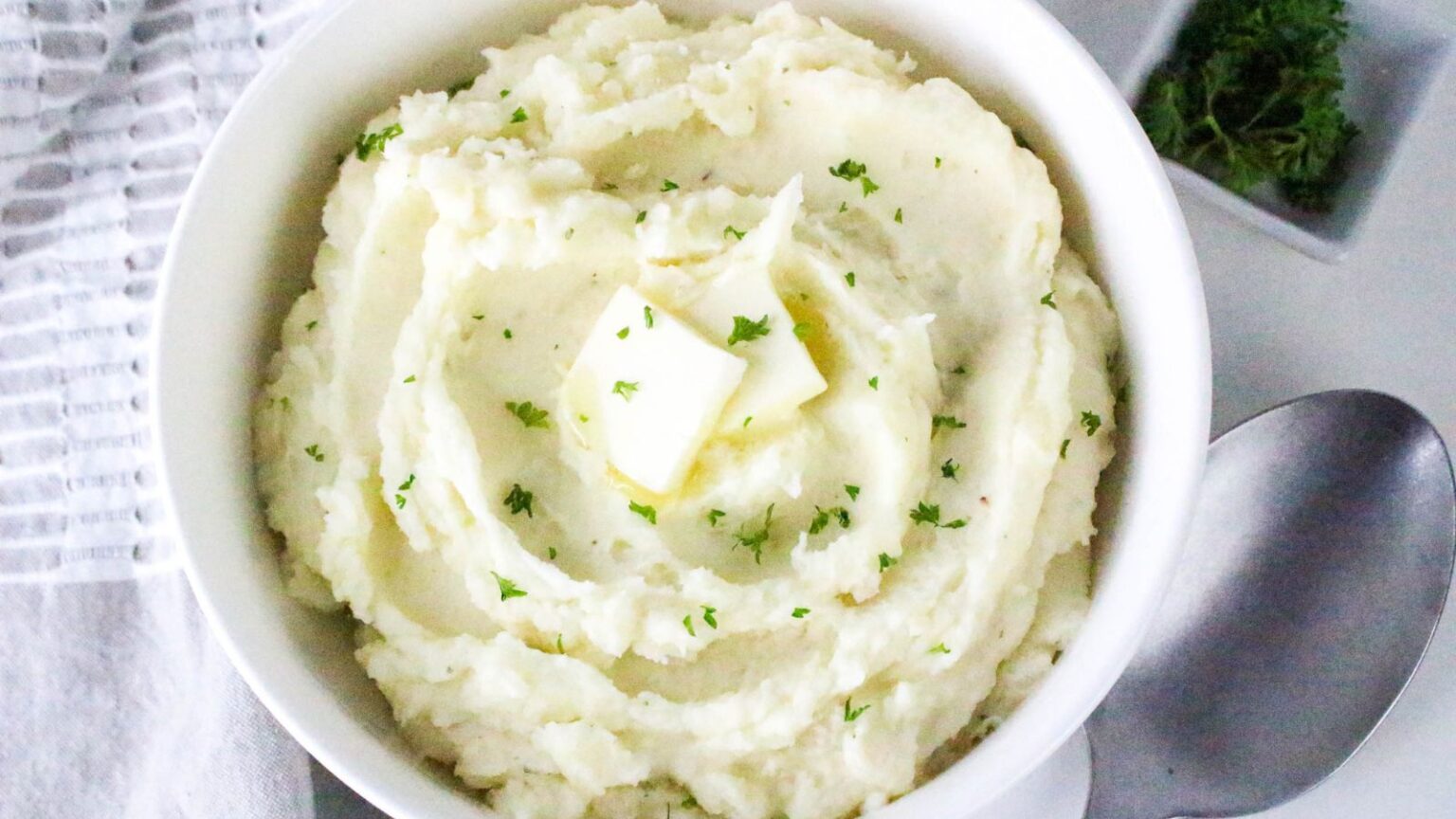 Bowl of mashed potatoes with a pat of butter on top, garnished with parsley. A spoon and a sprig of parsley are next to the bowl.