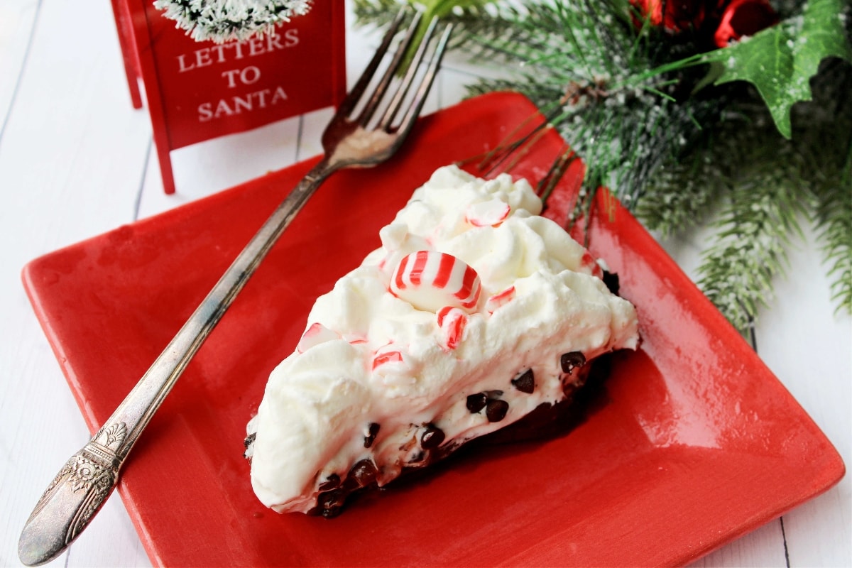A slice of chocolate chip pie topped with whipped cream and peppermint candies sits on a red plate with a fork, next to festive holiday decorations.