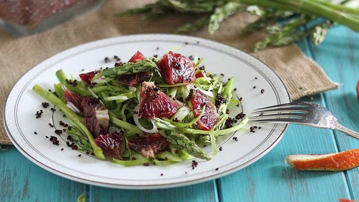 Thinly sliced asparagus pairs with juicy blood orange segments. A light dressing brings everything together without overpowering the ingredients. The textures stay crisp and fresh. It is a visually striking salad with bold flavor contrast.