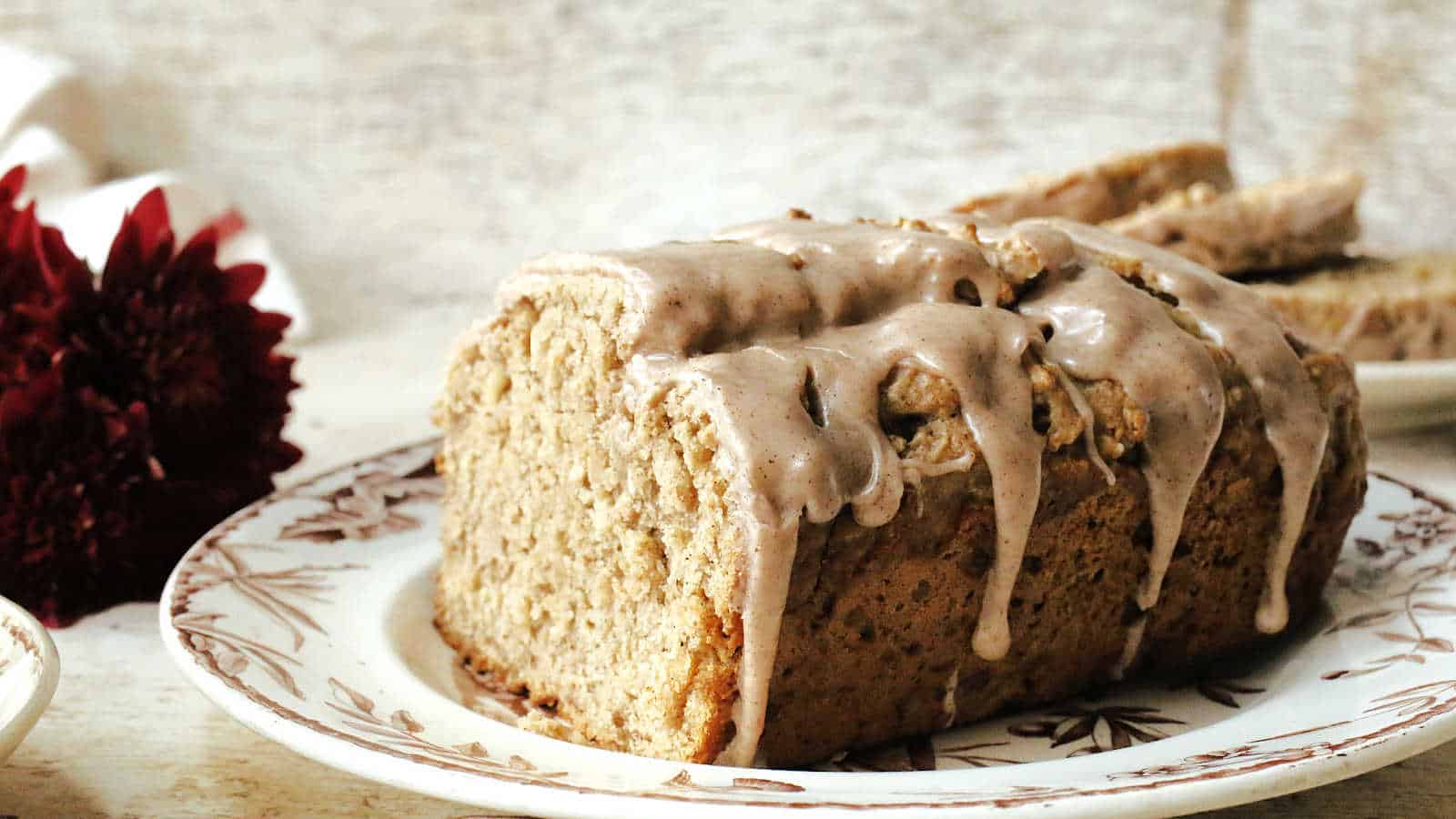 Iced Oatmeal bread on a brown and white plate.
