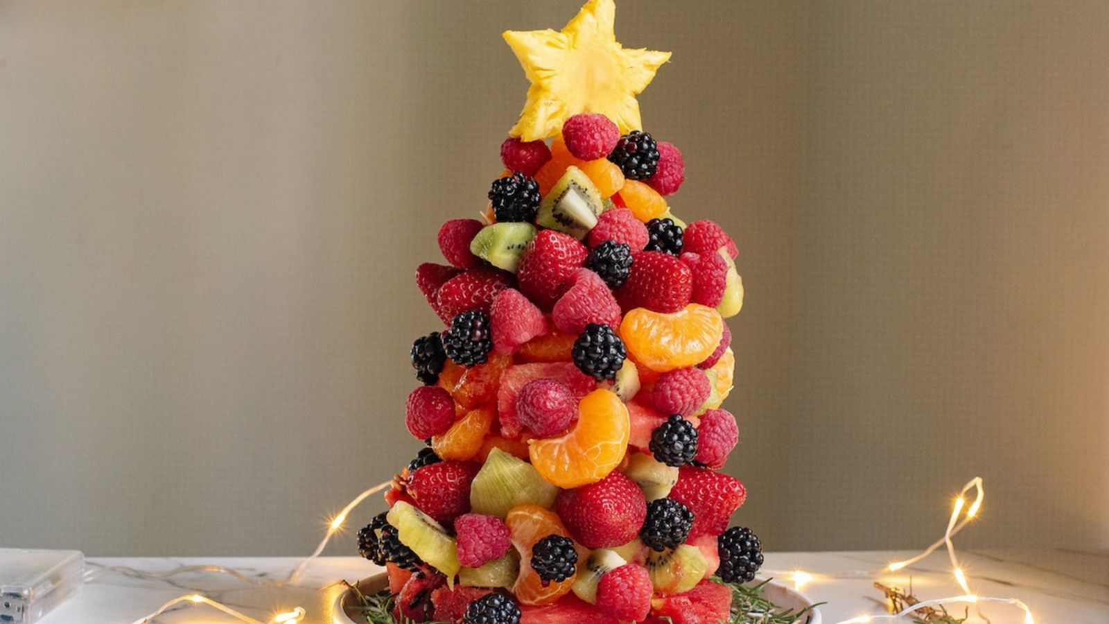 Fresh fruit is arranged in a layered tree shape. The arrangement holds together without baking. The fruit stays fresh and visually appealing. A simple drizzle or glaze can add shine and sweetness.