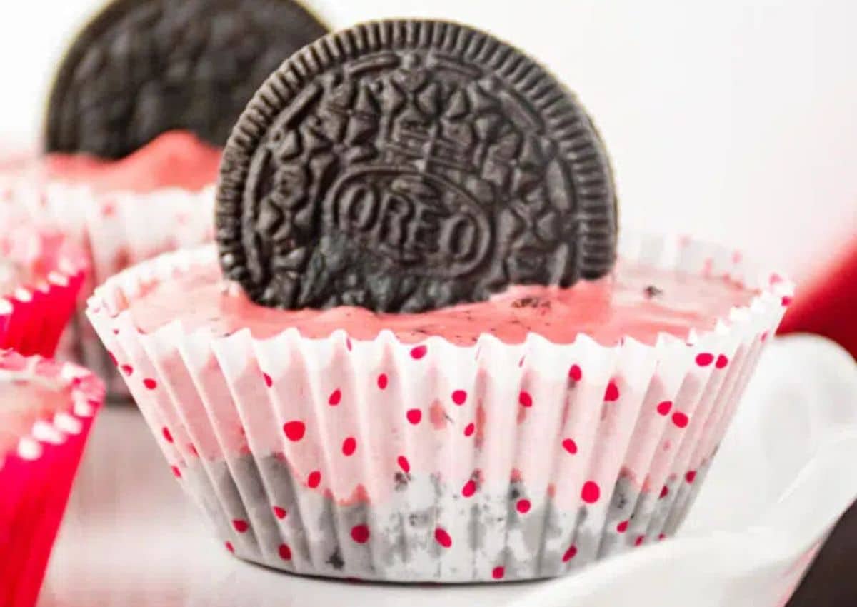 These individual cheesecakes have a red velvet-flavored filling on top of a crushed Oreo base. They’re set in muffin tins or jars and chilled until firm. The texture is creamy, and the chocolate crust adds crunch. A great option for easy serving.