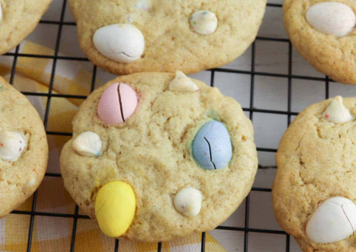 These cookies are studded with mini eggs for bright pops of color. The dough is soft and holds the candy well without melting entirely. Each bite is a combination of sweet cookie and chocolatey crunch. They are small, easy to share, and cheerful.