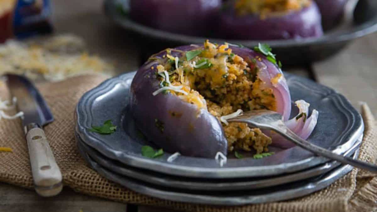Large onions are hollowed out and filled with spiced rice and meat. Baking them makes the onions tender and slightly sweet. The filling is bold with Mexican-inspired spices. Top with cheese or cilantro before serving.