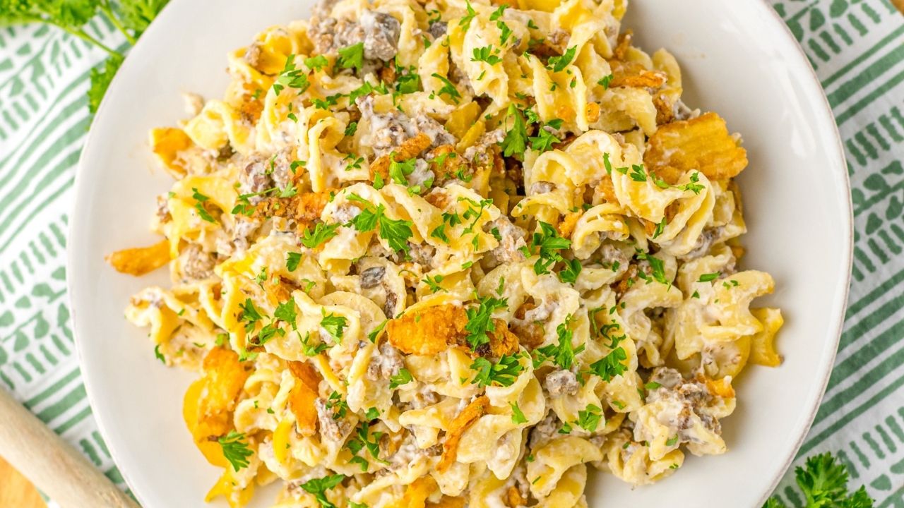 Tender beef and pasta bake with caramelized onions and a creamy sauce. A cheesy topping turns golden in the oven. The onions give the dish deep, savory flavor. Itโs hearty and ideal for feeding a crowd.