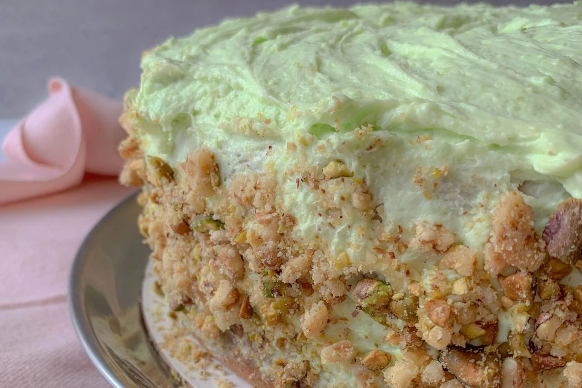 Classic cake layered with pistachio pudding, whipped topping, and pineapple. Each slice is sweet, nutty, and creamy. A nostalgic dessert from retro cookbooks. Ideal for gatherings or casual dessert tables.