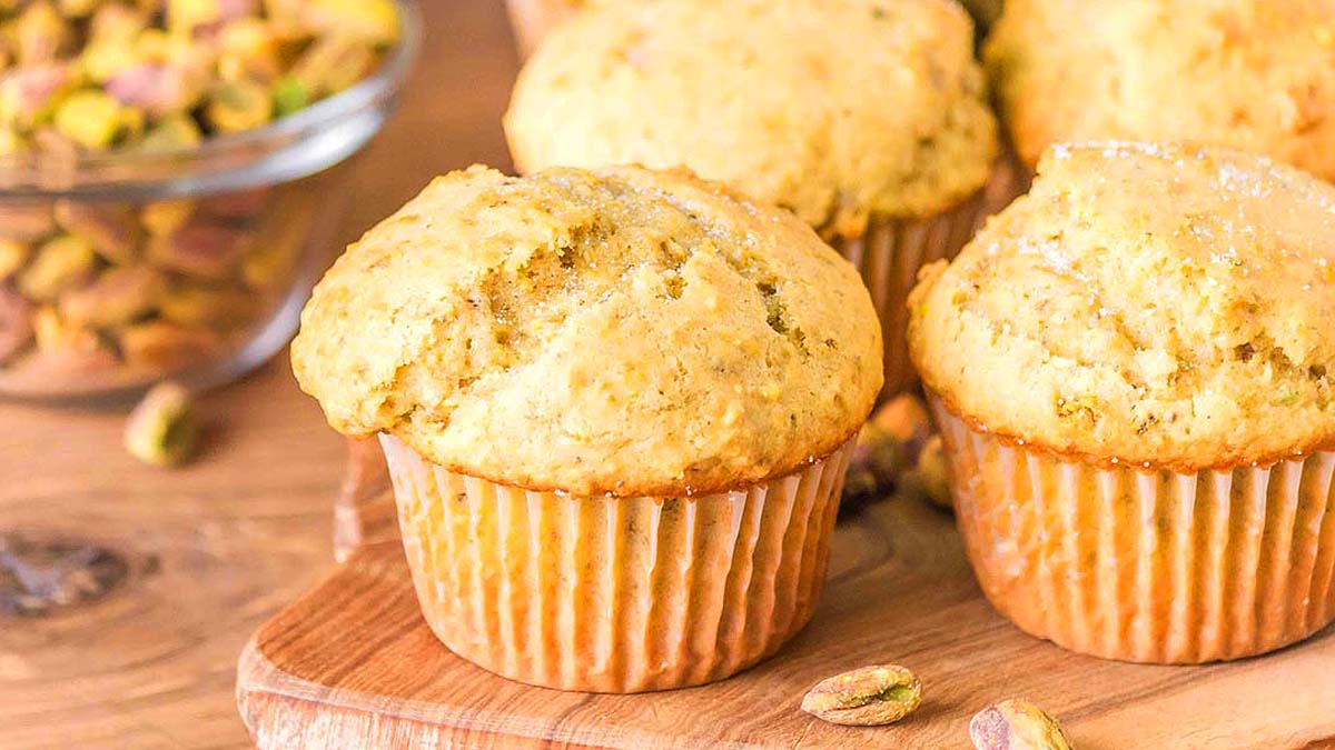 Moist muffins are filled with pistachios and sometimes complemented with fruit or chocolate. The nuts provide crunch and earthy flavor throughout. Each muffin is tender and slightly golden on top. They are easy for breakfasts or snack time.
