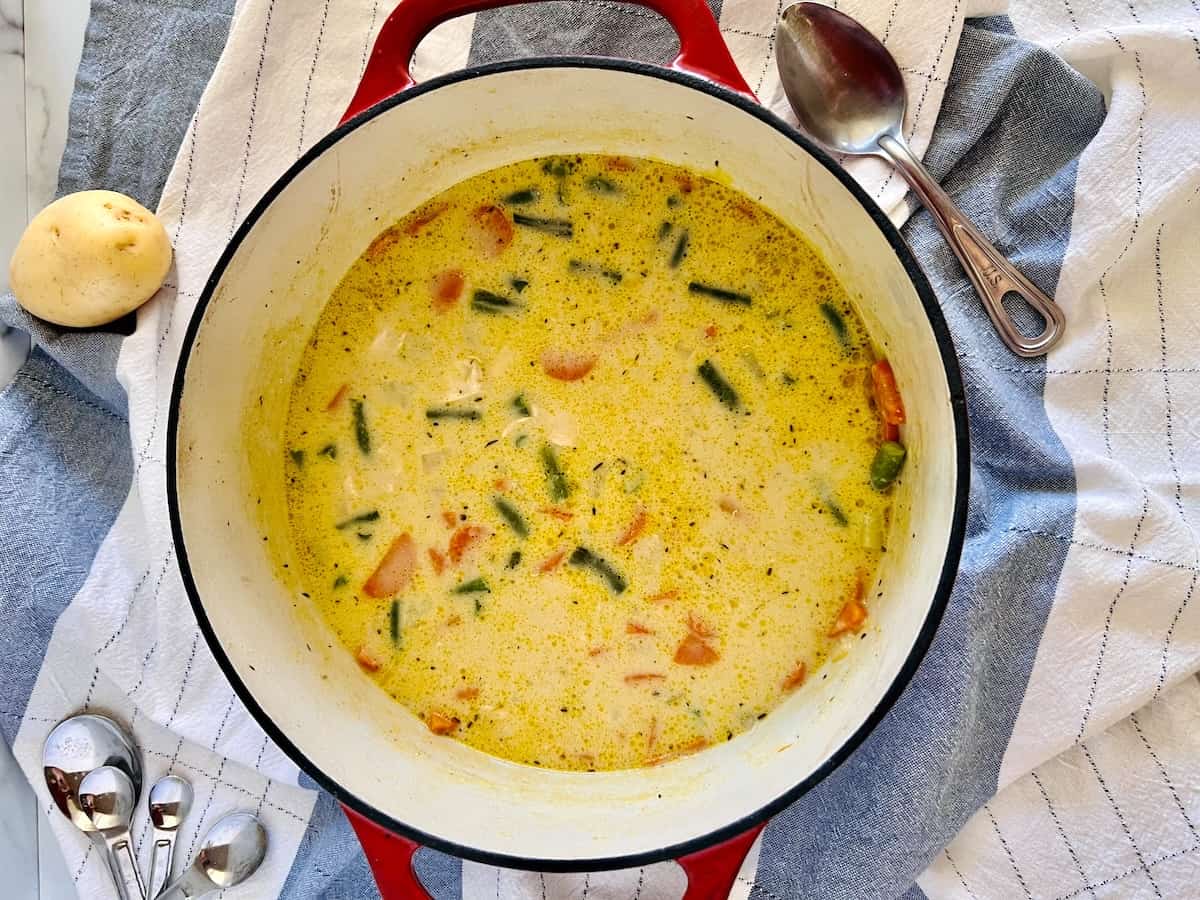 This soup combines chickpeas with vegetables in a seasoned broth. Ingredients soften without falling apart. The soup stays thick and hearty. It works well as a main or side.
