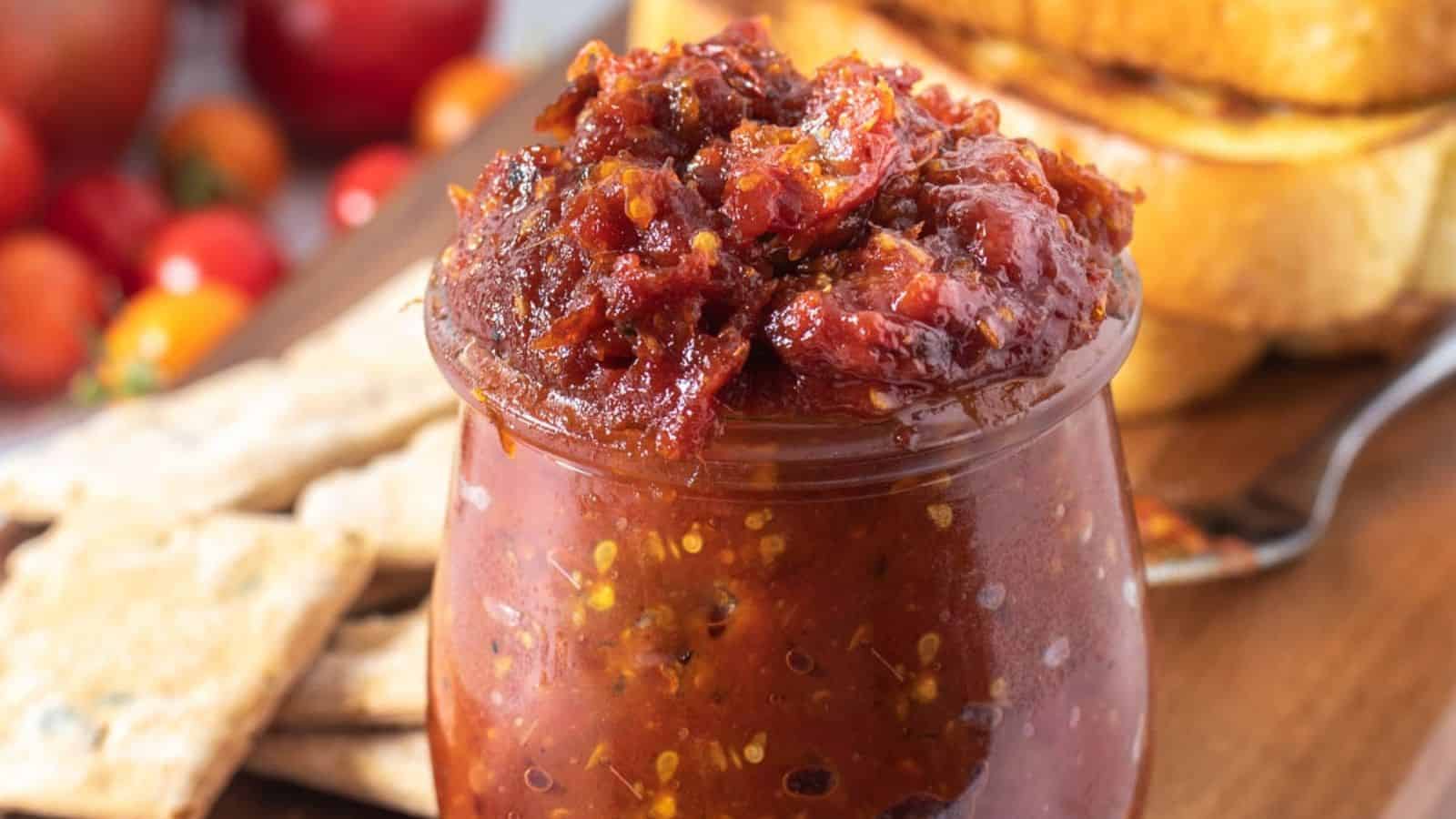 Tomatoes are cooked down with miso paste into a thick, umami-rich jam. It can be used as a spread, condiment, or glaze. The flavor is savory with a hint of sweetness. It is versatile for both meats and breads.