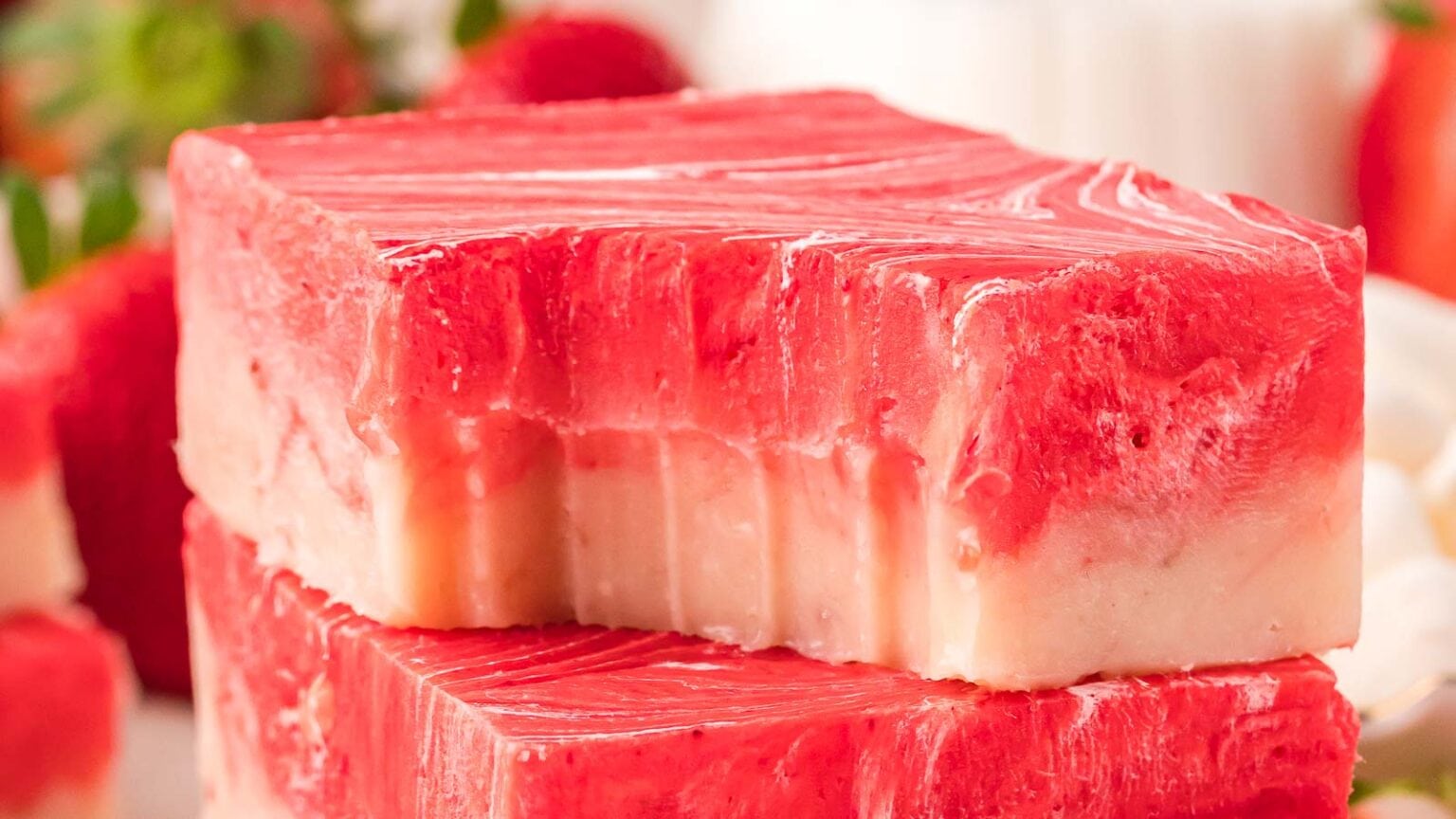 This fudge has a smooth, melt in your mouth texture. Strawberry flavor blends evenly with the creamy base. It sets firmly for clean slices. Store it chilled until ready to serve.