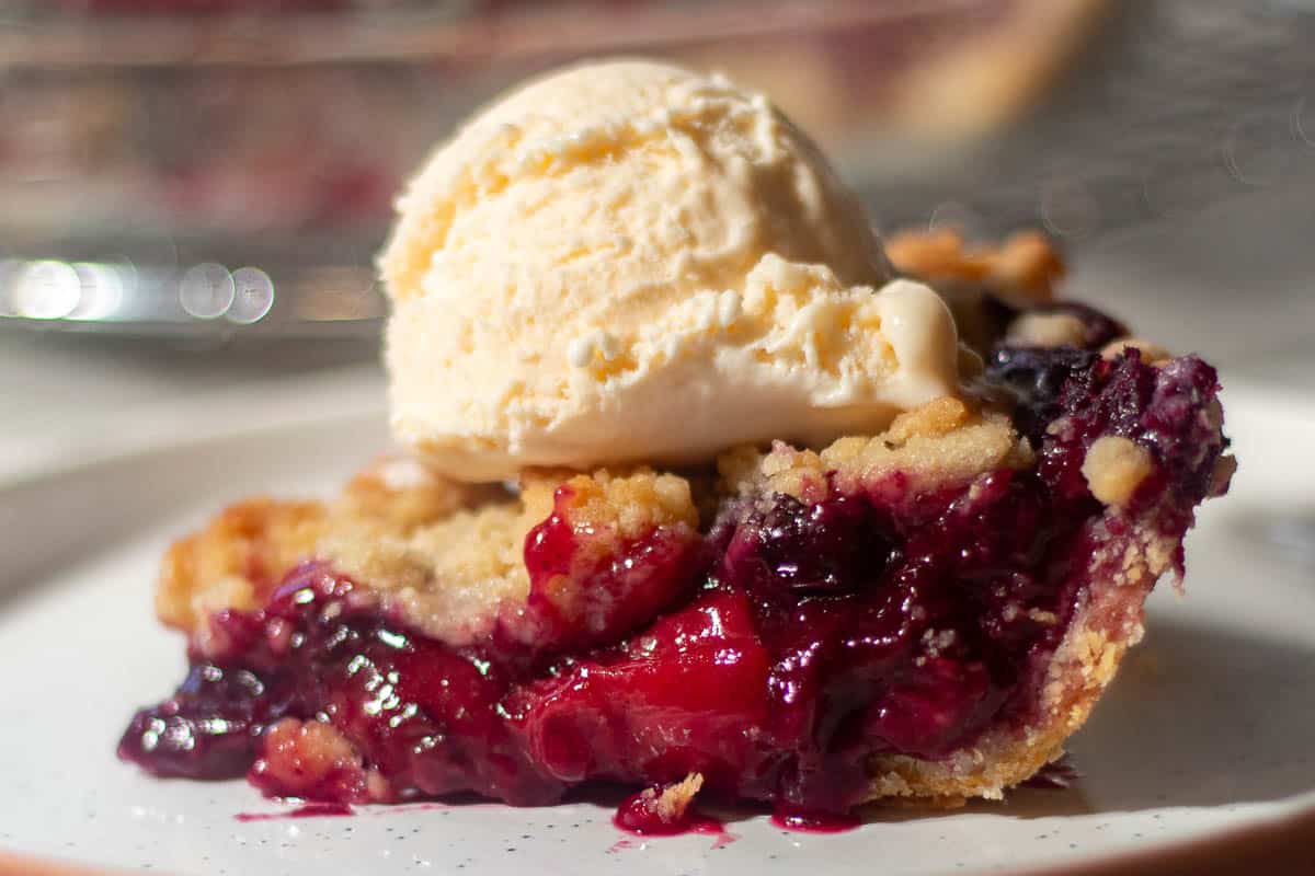 Two types of berries are baked into a thick filling. A crumb topping replaces the top crust for extra texture. The filling sets firmly as it cools. Serve it slightly warm or fully chilled.