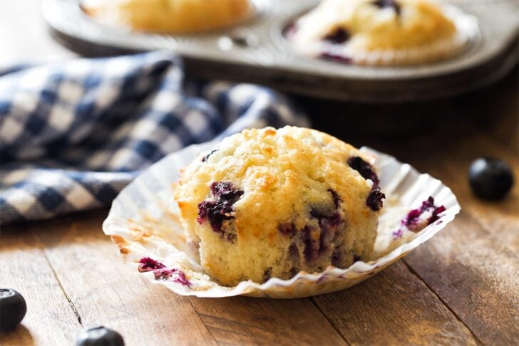 Moist Small Batch Blueberry Muffins without sour cream is a 6 muffin recipe bursting with fresh blueberries in every bite.