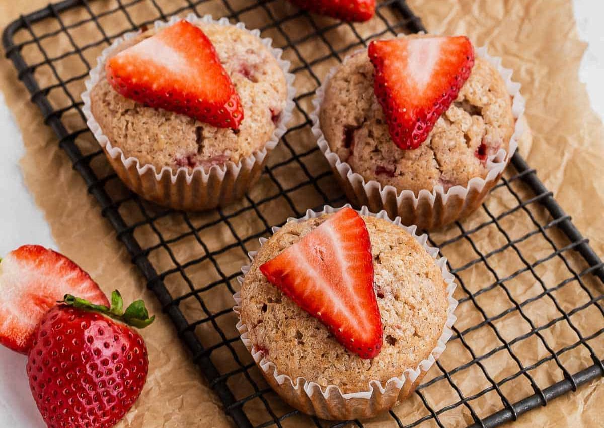 These strawberry muffins are light, full of fresh strawberries, and packed with flavor. The recipe is healthy because it’s made with an egg white and buttermilk. It makes 4 muffins for a small batch recipe, but it can be doubled or tripled to serve more.