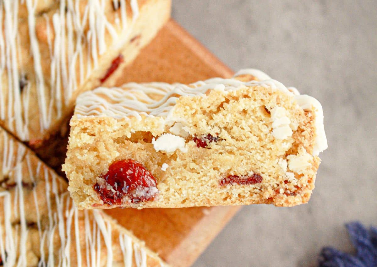 These chewy bars mix cranberries and white chocolate into a soft base. The result is tangy, sweet, and full of texture. They cut easily into squares, making them great for sharing. A festive bake for the holidays.