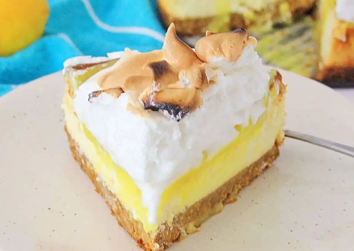 Tangy lemon filling tops a creamy cheesecake base, crowned with fluffy meringue. The sweet-tart balance is spot-on. Light browning on the meringue adds both flavor and beauty. A striking dessert for citrus fans.