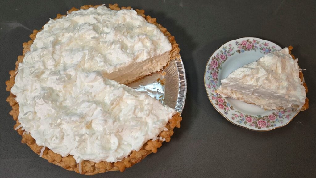 A creamy pie layered with coconut and white chocolate flavors. The texture is smooth and fluffy. Often topped with nuts or extra coconut. A festive dessert for winter celebrations.