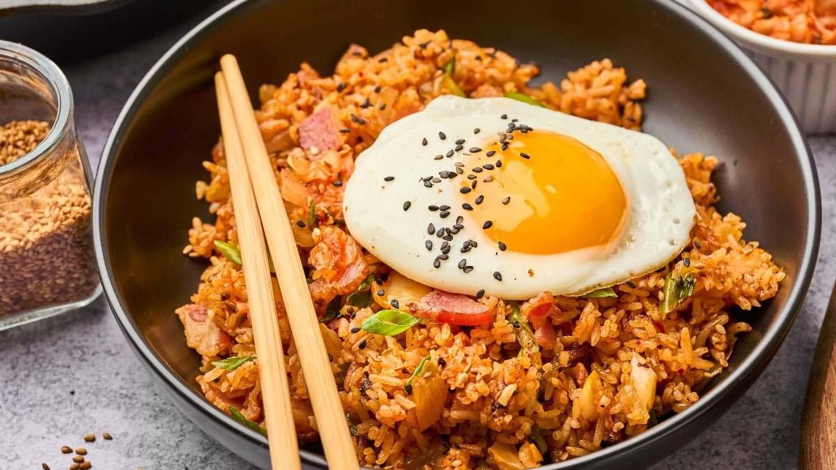 Tangy, spicy kimchi gives this fried rice a bold punch. A fried egg on top makes it even richer. The fermented cabbage brings both heat and acidity to balance the rice. A drizzle of sesame oil completes the dish.