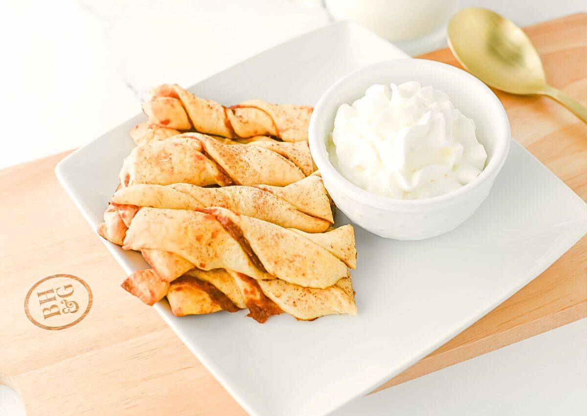 A plate with several cinnamon twists next to a small bowl of whipped cream, placed on a white square dish with a gold spoon nearby.