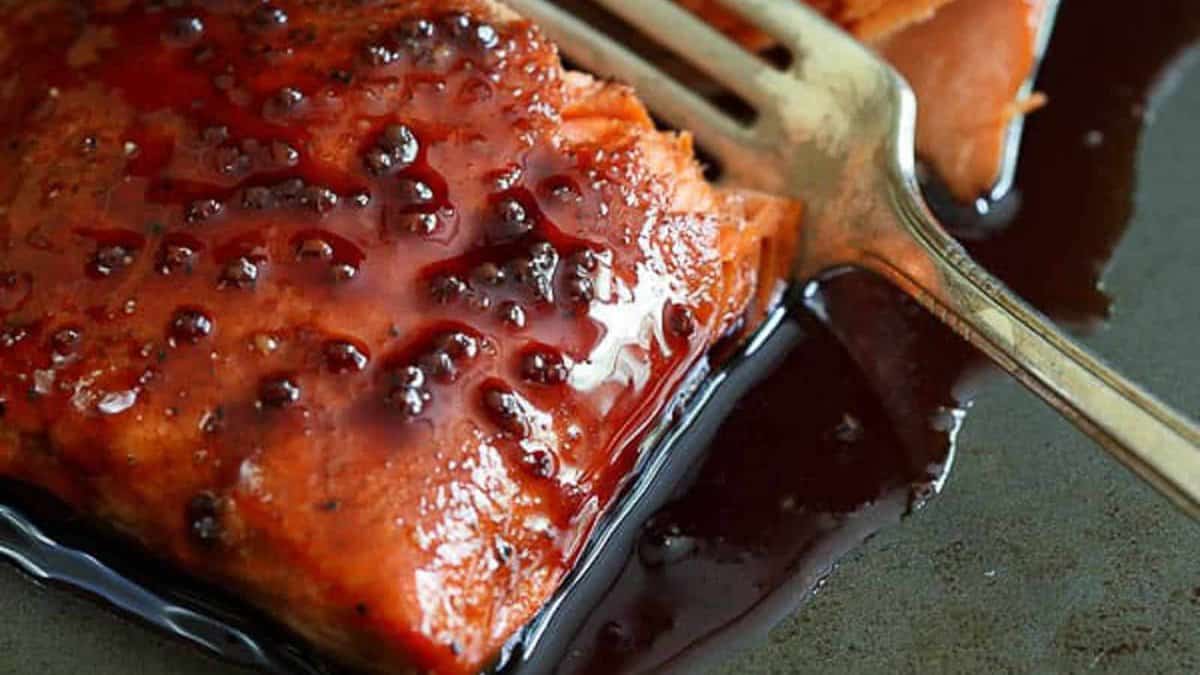 Tart cherry glazed salmon is coated in a sweet and tangy fruit glaze. The oven caramelizes the glaze slightly. It pairs well with simple sides like roasted vegetables or rice. Each bite has a balanced sweetness and tang.