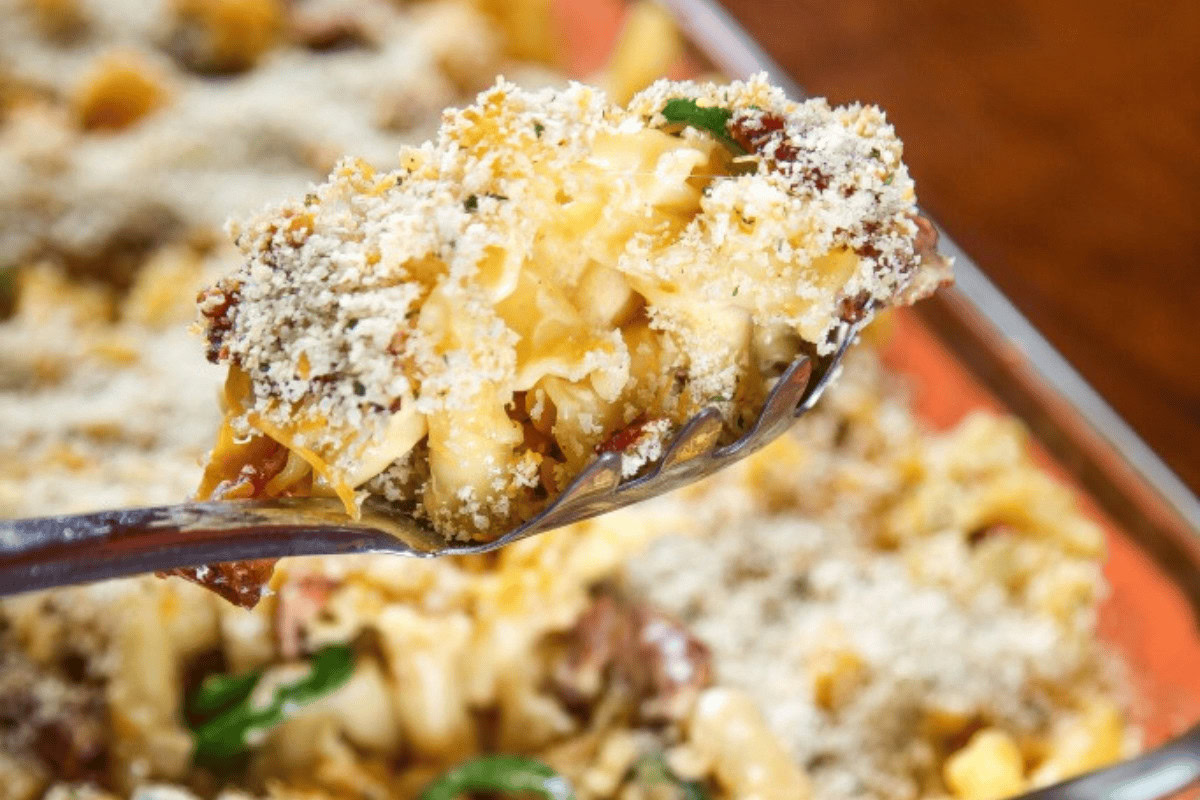Classic macaroni and cheese is combined with diced jalapenos and crispy bacon. The cheese sauce coats the pasta with creamy richness. Jalapenos add heat, and bacon adds smokiness. A decadent twist on a favorite comfort food.