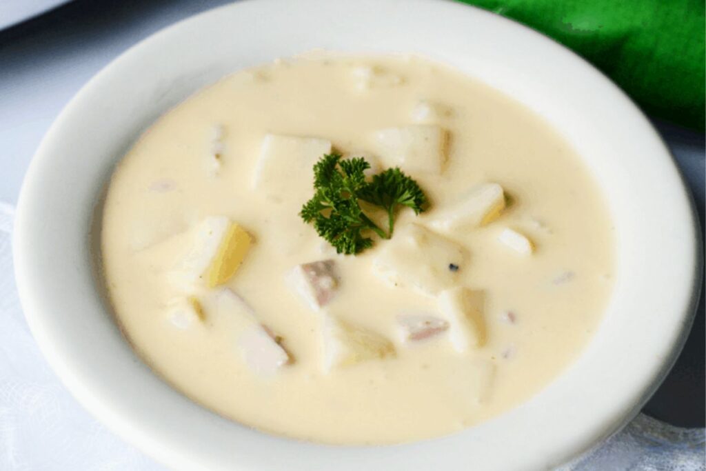 Tender potatoes are simmered with ham, cheese, and cream in a soup. The texture is creamy with chunks of potato and ham throughout. Cheese adds richness and depth. It’s hearty, comforting, and perfect for cooler days.