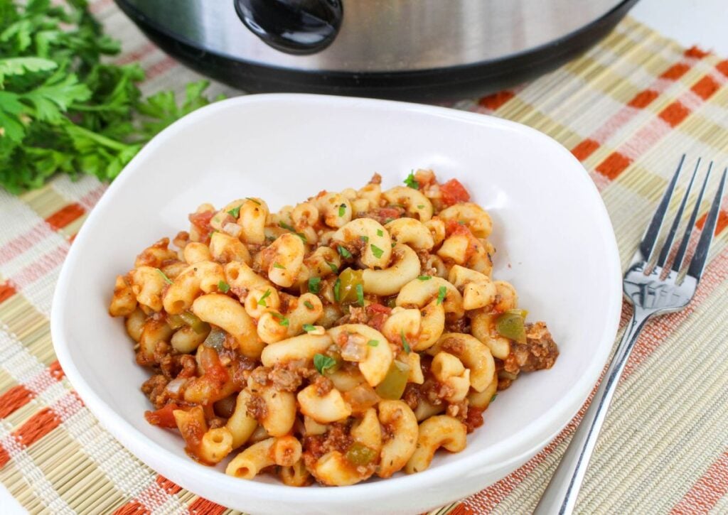 Ground beef, pasta, taco seasoning, and cheese cook together for a mash-up of two favorites. Itโs creamy, cheesy, and packed with flavor. The slow cooker makes it extra easy. Great for kids and quick meals.