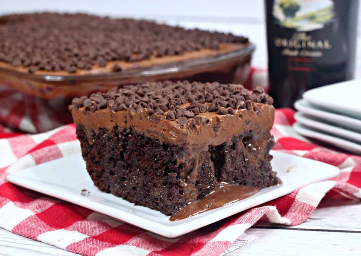 Chocolate cake is soaked with Baileyโs Irish Cream and topped with fluffy whipped topping. The liqueur sinks into the holes for bold flavor in every bite. Itโs boozy but smooth. Chocolate shavings or drizzle make it party-ready.