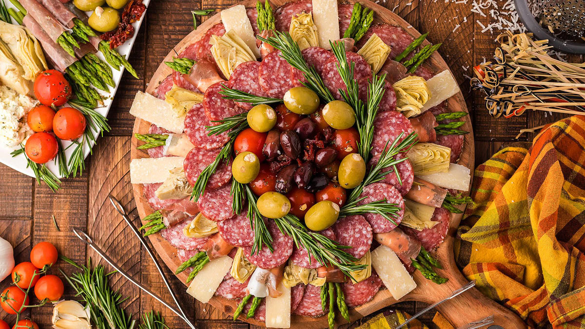 A mix of cured meats, cheeses, olives, and vegetables arranged on a board. The variety of textures and flavors is appealing. Itโs visually inviting and easy to share. Each bite offers a different taste experience.