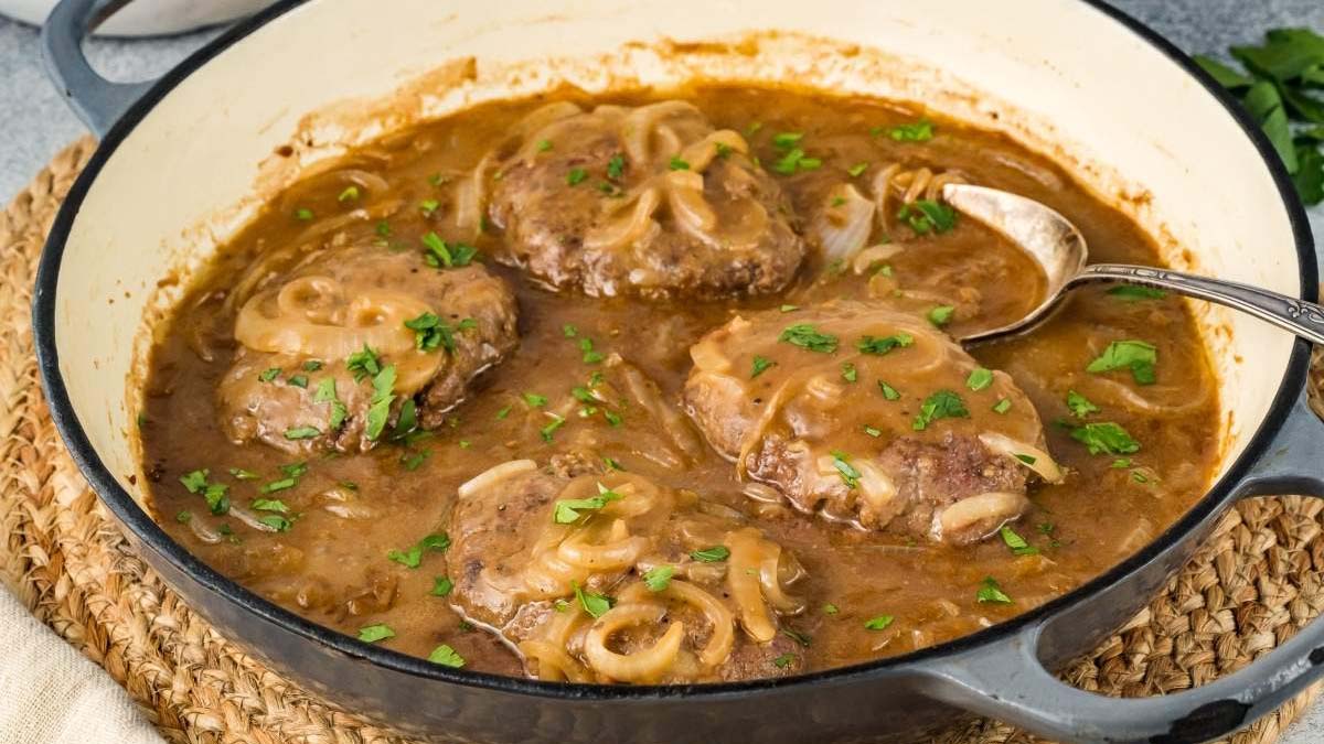 Baked or pan-fried hamburger patties are topped with a rich mushroom gravy. The gravy clings to each bite, adding flavor and moisture. The patties stay tender while cooking. Itโ€™s a classic comfort combination.