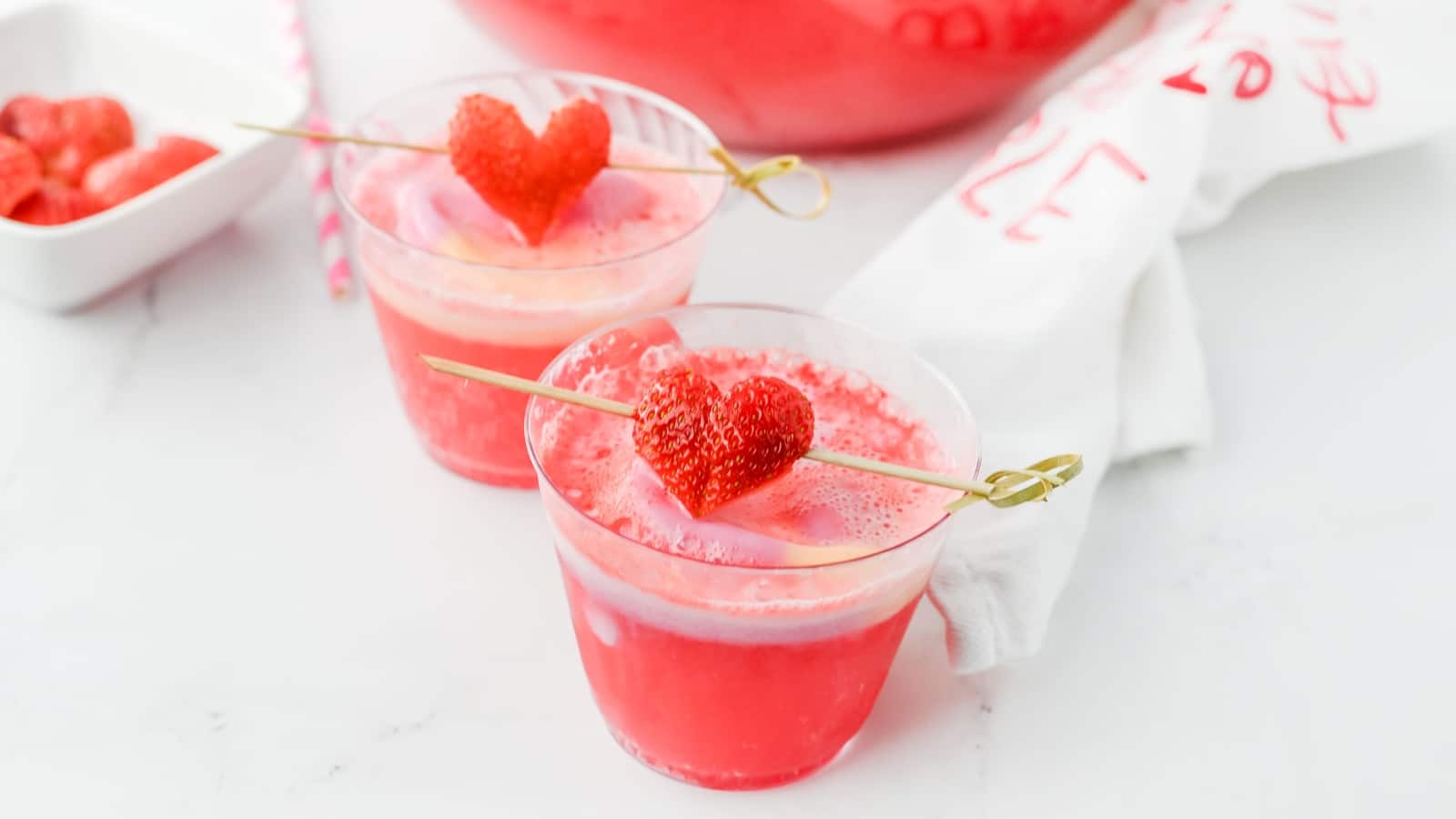 A fruity beverage combining strawberries with other juices or sparkling water. The punch is colorful and refreshing. Fresh fruit pieces float in the drink for added appeal. It’s lively and fun for gatherings.
