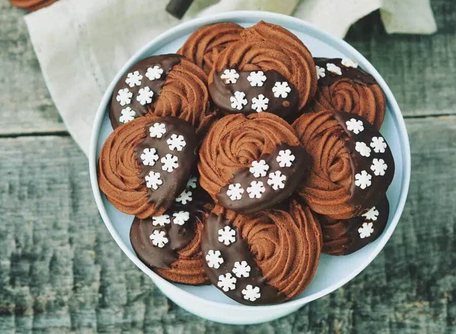 Cookies are rich with cocoa and coated in powdered sugar. Baking produces a tender, slightly crumbly texture. Each bite is chocolatey and sweet. Theyโre fun and festive for winter.