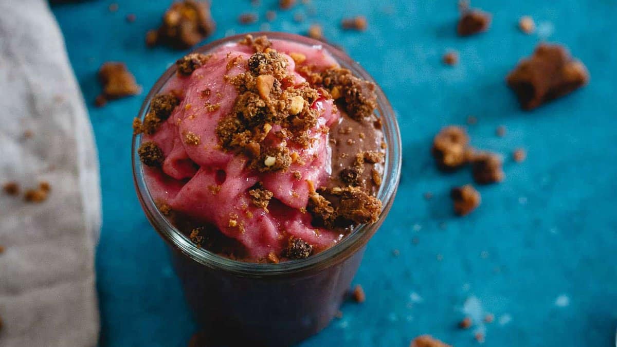 This pudding layers chocolate, peanut butter, and strawberry flavors. Chia seeds help the mixture thicken as it rests. The texture becomes spoonable after chilling. Each layer stays visually distinct.