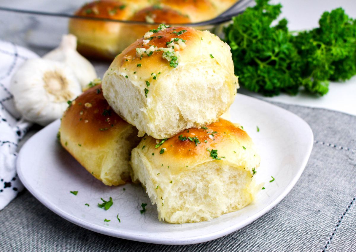 Soft dinner rolls are brushed with garlic butter fresh out of the oven. Theyโre pillowy inside with a golden top. Great for soaking up sauces or pairing with soups. They never last long.