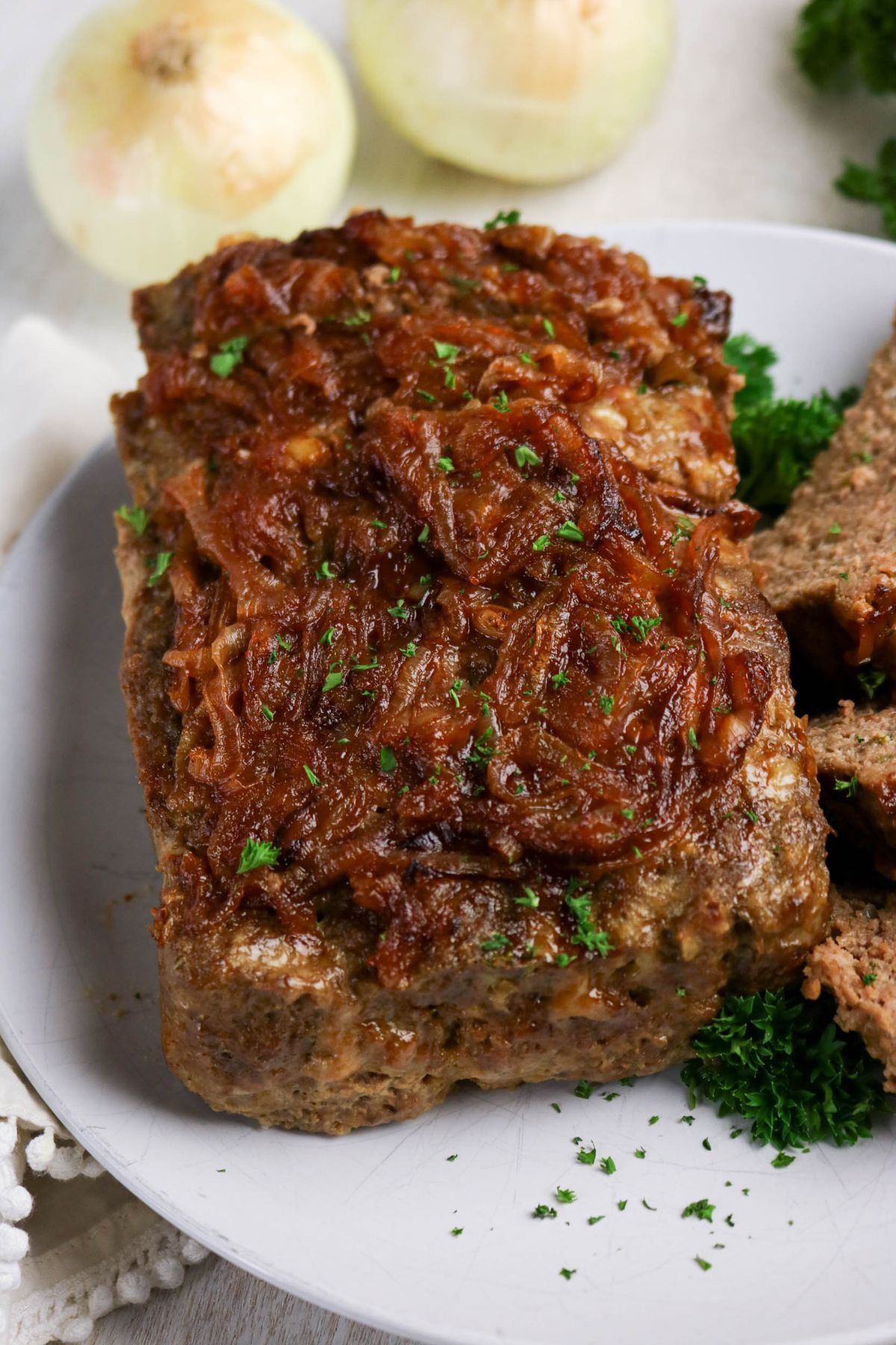 A plate of sliced meatloaf topped with caramelized onions, garnished with fresh parsley, on a white surface with onions in the background.